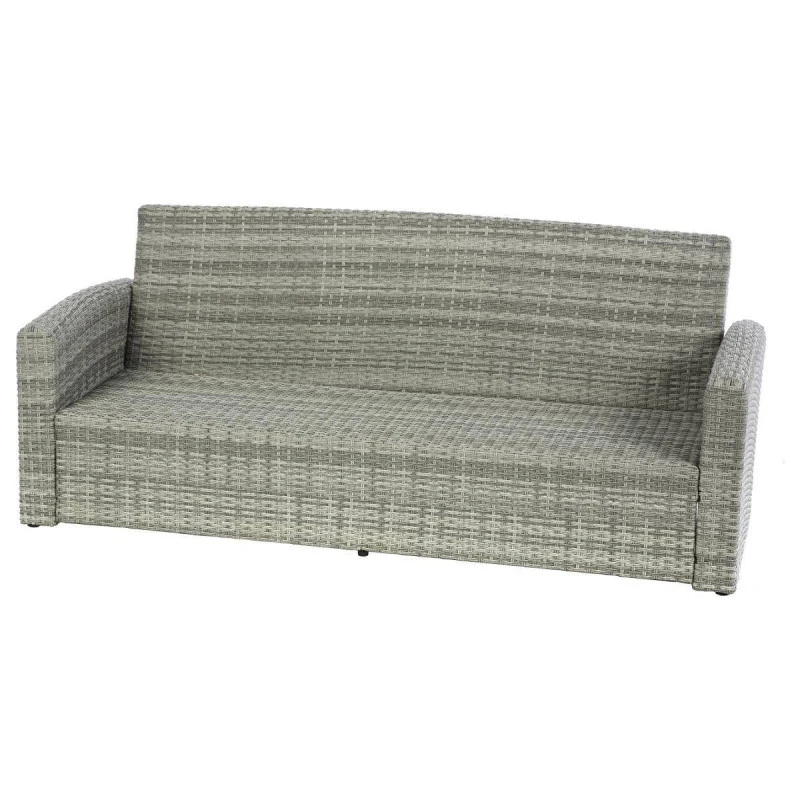 Ce canapé est conçu spécialement pour l’extérieur : sa structure est en aluminium traité époxy antirouille, son habillage est en résine synthétique tressée et ses coussins sont en polyester 180 g/m² traités déperlant et déhoussables.