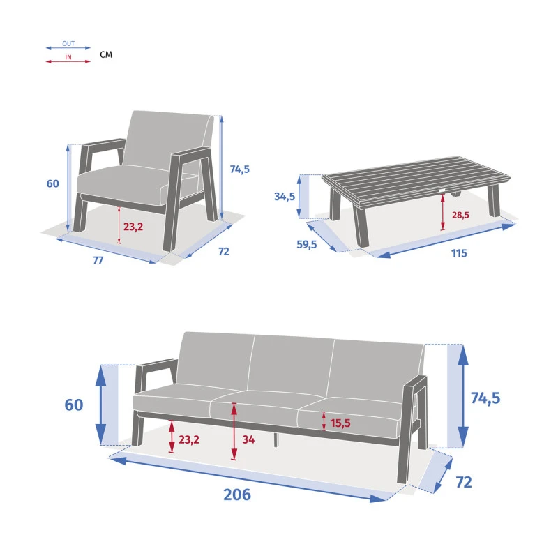 Les coussins sont recouverts d’un tissu oléfine 240 g/m² traité déperlant pour permettre une élimination rapide des petites pluies. Ils sont également déhoussables pour un entretien facile.