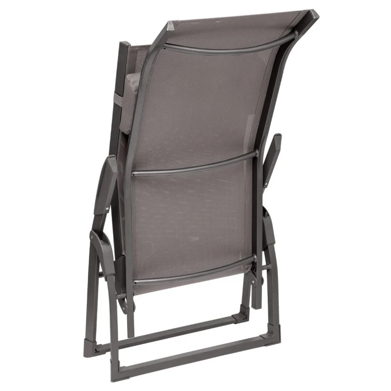 Conçu pour résister, le transat dispose d’une structure en aluminium traité époxy antirouille et d’une assise en texaline (polyester enduit PVC) 570 g/m².