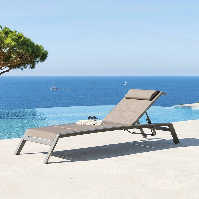 Conçu pour résister, le transat dispose d’une structure en aluminium traité époxy antirouille et d’une assise en texaline (polyester enduit PVC) 610 g/m² avec mousse séchage rapide.